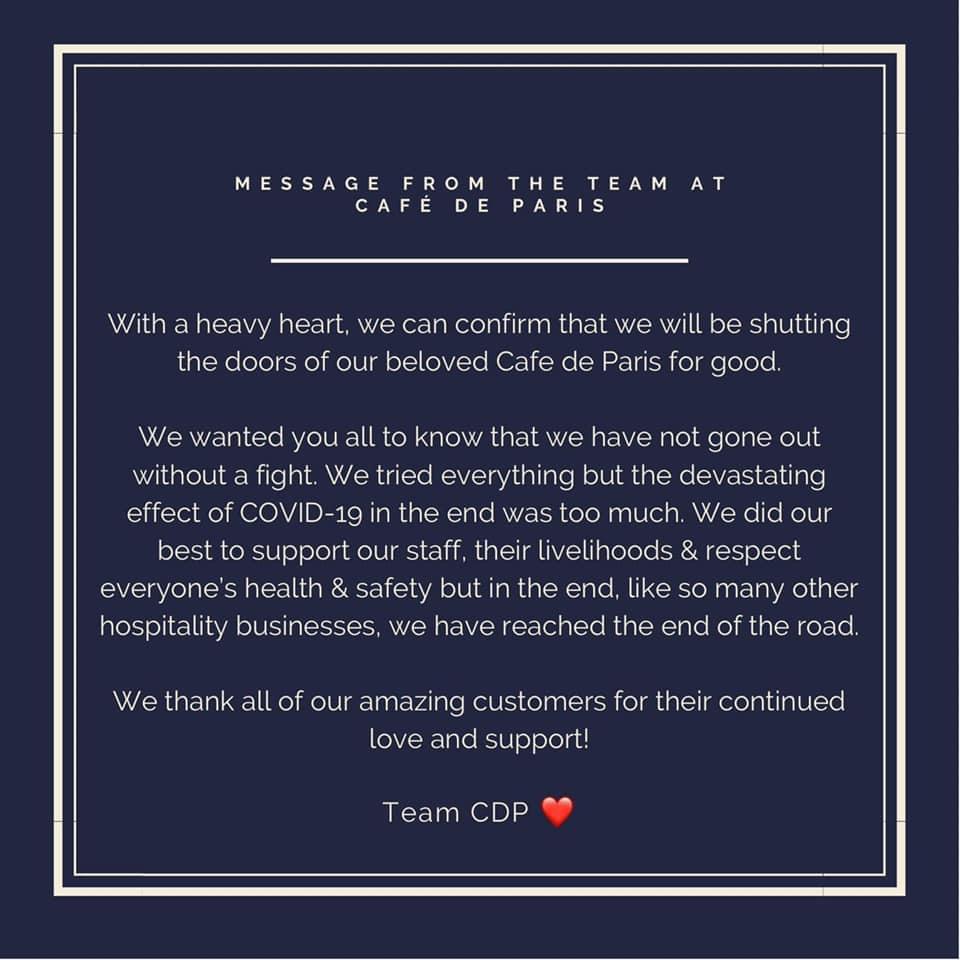 "With a heavy heart, we can confirm that we will be shutting the doors of our beloved Cafe de Paris for good.